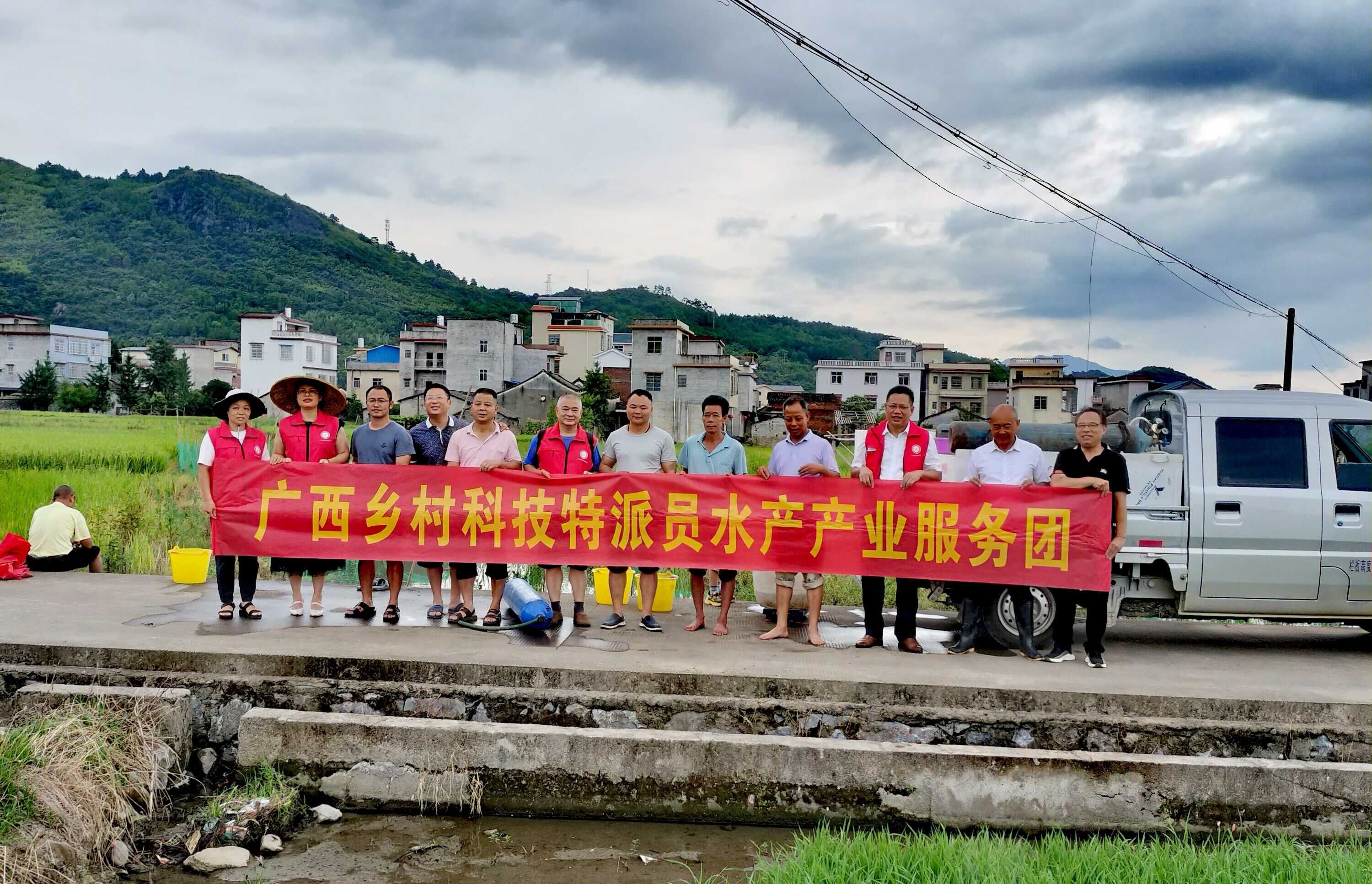 7月18日,广西水产科学研究院水产产业先锋队及乡村科技特派员一行共3人到桂林市灌阳县新街镇石丰村开展服务活动,向该村赠送大规格金边禾花鲤鱼种30000多尾,并在该村进行现场投放。
